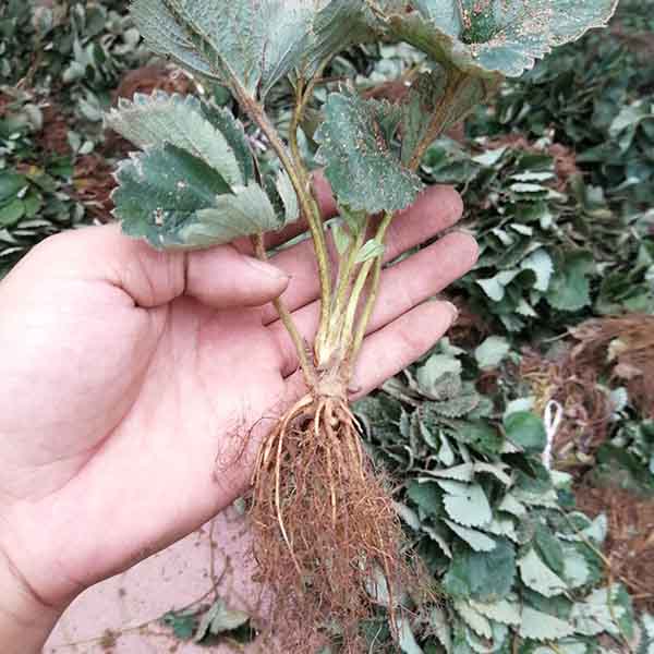甜查理草莓苗葉片近圓形較厚,葉色深綠,葉緣鋸齒較大鈍圓,葉柄粗壯有茸毛,植株健壯,根系發達,株型較緊湊,生長勢強,花序二歧分枝。高抗灰霉病和白粉病,對其他病害抗性也很強,很少有病害發生,適應性廣,休眠期在45小時左右較短。