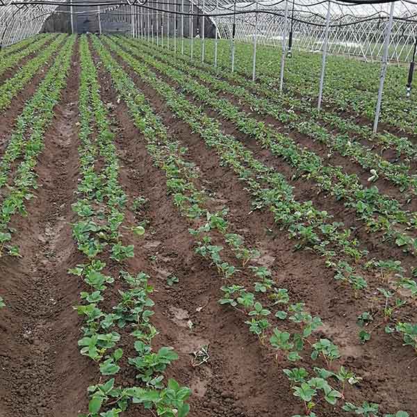 溫室草莓定植時間一般為8月末-9月10日之間(假植苗可在9月末以前)。定植前一周,整地施肥,結(jié)合翻地畝施充分腐熟的農(nóng)家肥3-5t,氮磷鉀復(fù)合肥或草莓專用復(fù)合肥50kg,深翻30-35cm,與土壤充分拌勻。